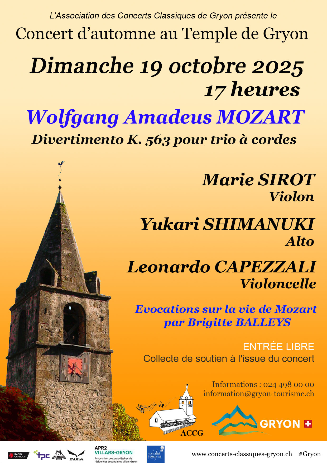 19Oct 25 Concert d'automne 2025 Début: 17:00 Lieu: Temple de Gryon Divertimento en mi b majeur, K.563, pour trio à cordes, de Wolfgang Amadeus MOZART. Marie Sirot, violon, M. Yukari Shimanuki, alto, Leonardo Capezzali, violoncelle